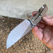 Blade is .150" thick stainless Magnacut Stainless steel. It features bright stonewash flats and hand-ground satin bevels.